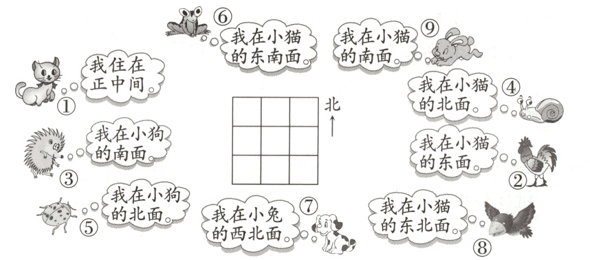 2. 找位置。(请把小动物的编号填在方格图中)