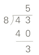 4. 二(6)班43人站队,每8人站一排,能站几排?还剩几人?列式计算为43÷8 = 5(排)……3(人)。观察右面的竖式
