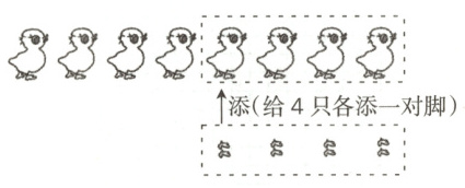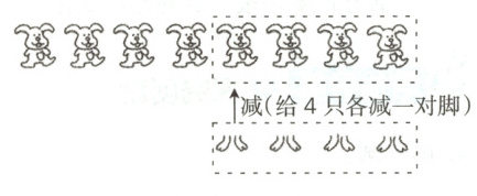 (2)假设8只都是兔,一共有( )只脚,比24( ),要给( )只兔各减去一对脚,那么鸡有( )只,兔有( )只。