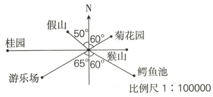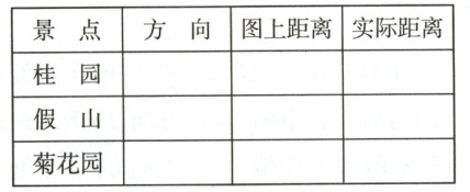 3. 以猴山为观测点,公园的部分景点如下图,量一量,算一算,填写下表。