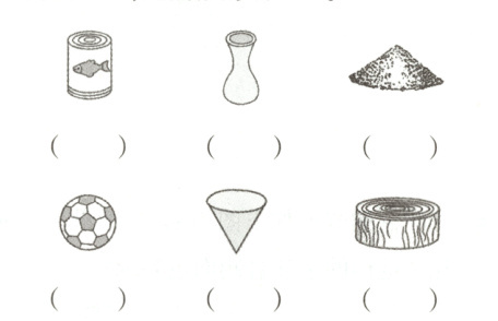 1. 下面各图中,物体的形状是圆柱的在括号内画“○”,是圆锥的画“△”。