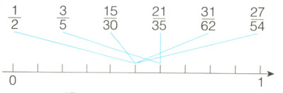 2. 下面哪些分数在直线上能用同一点表示?把分数和相应的点连起来。(3分)