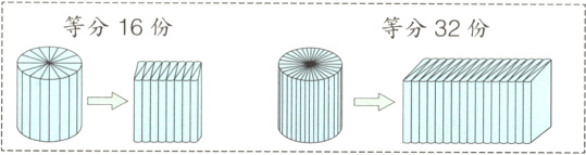 2. 根据圆柱体积的推导过程可知,把圆柱切拼成一个近似长方体,只是形状变了,但体积不变。拼成的长方体的底面积等于圆柱的底面积,长方体的高等于圆柱的高。
