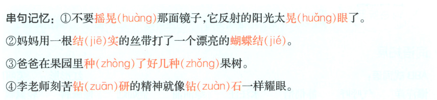 串句记忆:①不要摇晃(huàng)那面镜子,它反射的阳光太晃(huǎng)眼了。②妈妈用一根结(jiē)实的丝带打了一个漂亮的蝴蝶结(jié)。③爸爸在果园里种(zhòng)了好几种(zhǒng)果树。④李老师刻苦钻(zuān)研的精神就像钻(zuàn)石一样耀眼。