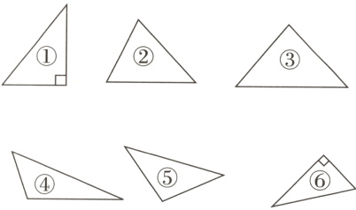 2. 下面的三角形各是哪类三角形?(请把序号填在相应的圈里)