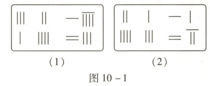 解析:通过图10 - 1(1)发现算筹图中十位上的数字用横线表示,个位上的数字小于5时用竖线表示,大于5时用横线加竖线表示,则图10 - 1(2)所示的算筹图可表示为$\begin{cases}2x + y = 11\\4x + 3y = 27\end{cases}$.