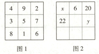 9 (武汉中考)幻方是古老的数学问题,我国古代的《洛书》中记载了最早的幻方——九宫格. 将9个数填入幻方的空格中,要求每一横行、每一竖列以及两条对角线上的3个数之和相等,例如图1就是一个幻方. 图2是一个未完成的幻方,则x与y的和是( )