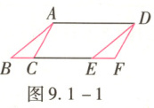 典例2 如图9.1 - 1,将面积为3的三角形ABC沿BC方向平移到三角形DEF的位置,CE = 5,EF = 2,∠B = 40°,则