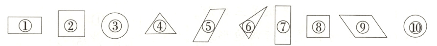 三角形( ),圆( ),正方形( ),长方形( ),平行四边形( )。