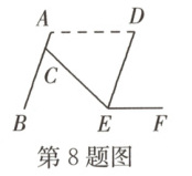 8. 新课标 应用意识(六安期末)随着科技发展,骑行共享单车这种“低碳”生活方式已融入人们的日常生活,如图是共享单车车架的示意图,线段AB,CE,DE分别为前叉、下管和立管(点C在AB上),EF为后下叉. 已知AB//DE,AD//EF,∠BCE=67°,∠CEF=137°,则∠ADE的度数为( )