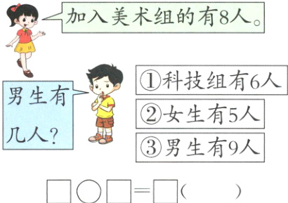 3. 一(2)班加入美术组和科技组的共有14人,____。先选择条件(在横线上填序号),再解答。