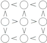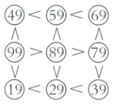 [提示]由题意可知,第二行最左边的〇里应填最大的数99,再根据“>”和“<”依次推出其他〇里的数。