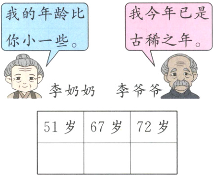 [提示]由题意可知,李爷爷今年70岁,李奶奶比李爷爷小一些,因为这三个数中,67比70小一些,所以李奶奶应是67岁。