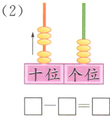 (2)54 - 30 = 24 [提示]原来十位上有5个珠子,表示5个十,个位上有4个珠子,表示4个一,合起来是54,从十位上拨走3个珠子,表示减去30。