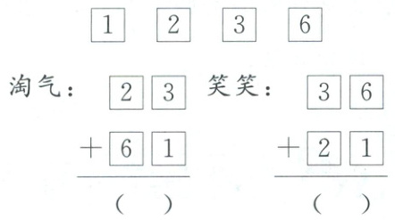 5. 新考法 竖式探究 淘气和笑笑玩摆竖式的游戏,他们用下面的4张卡片摆竖式,规定谁摆出的竖式的结果大谁就赢。