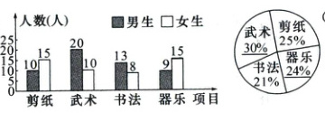(2)$\frac{10}{10 + 15}\times100\% = 40\%$. 答:在参加“剪纸”活动项目的学生中,男生所占的百分比为 40%;