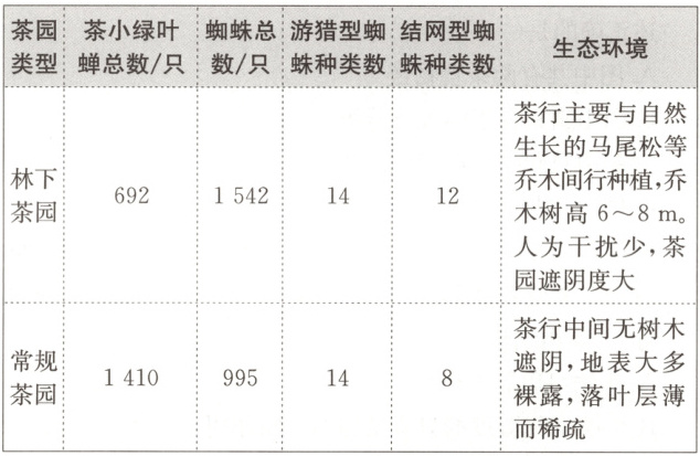 (2)林下茶园中茶小绿叶蝉的天敌——蜘蛛的总数多于常规茶园中蜘蛛的总数