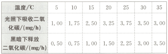 15. 生物小组发现温度与植物生长有密切关系。为探究这一问题,该小组将植物放在特定的实验装置中,实验结果如下表:(mg/h表示毫克/小时)