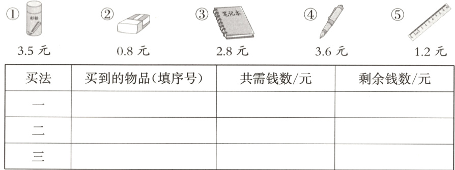 2. 方方有5元零花钱,他可以买哪两种文具?请列出三种买法填在下面的表格里。(9分)