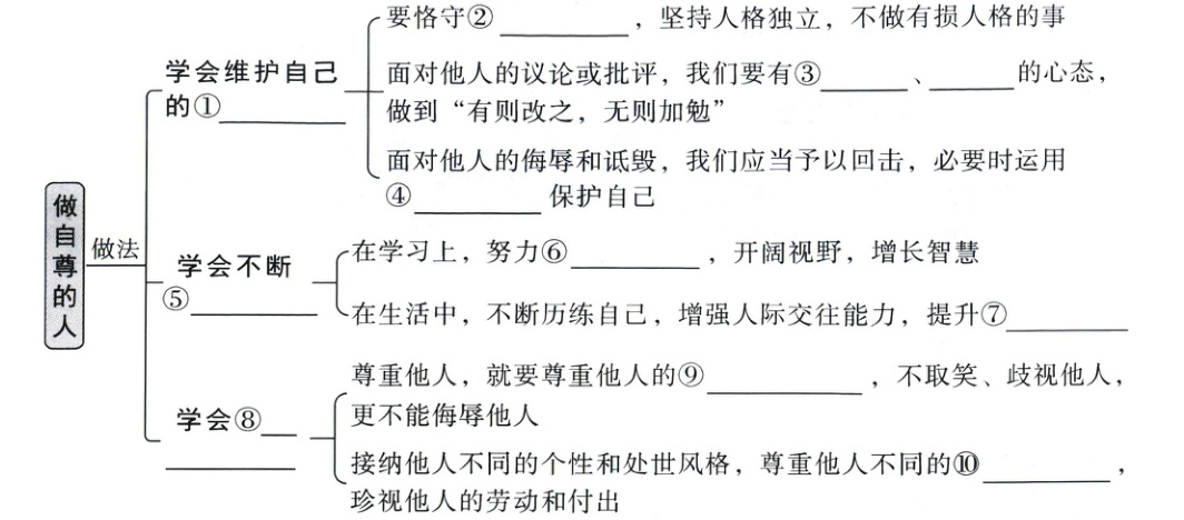 ①人格尊严 ②为人之德 ③平和 豁达 ④法律武器 ⑤提升自己 ⑥充实自己 ⑦个人修养 ⑧尊重他人 ⑨隐私和人格 ⑩生活习惯