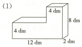 (1)表面积:(12×2 + 12×4 + 2×4)×2 = 160(平方分米);4×(8 - 4)×2 + 2×(8 - 4)×2 = 48(平方分米);160 + 48 = 208(平方分米);体积:12×2×4 + 4×2×(8 - 4) = 128(立方分米);