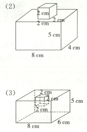 (2)表面积:8×4×2 + 5×4×2 + 8×5×2 = 184(平方厘米);2×2×4 = 16(平方厘米);184 + 16 = 200(平方厘米);体积:8×4×5 + 2×2×2 = 168(立方厘米);