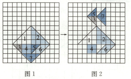 由图1变成图2,图形3先向上平移( )格,再向右平移( )格;图形5先向上平移( )格,再绕直角顶点按逆时针方向旋转( )°;图形7先向上平移( )格,再绕直角顶点按( )时针方向旋转90°。