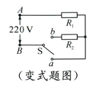 [变式题][原创题]如图所示是有“加热”和“保温”两个挡位电饭锅的简化电路原理图,AB两端电压为220 V且保持不变,其中$R_{1}$、$R_{2}$均为发热电阻。当开关S分别接“a”和“b”时,电流表的示数分别为5 A和2 A,则电阻$R_{2}$为______Ω;若电饭锅处于“加热”挡产生的热量为$6.6×10^{5}$J,则其在“加热”挡工作的时间为______s。