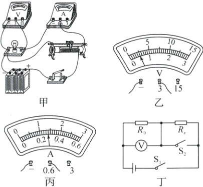 (4)完成上述实验后,他们又从实验室选取了另外一个电源(电压未知且不变)、阻值已知为R0的定值电阻、电压表、开关等器材,设计了如图丁所示的电路,测量出了待测电阻Rx的阻值,请你完成下列实验步骤: