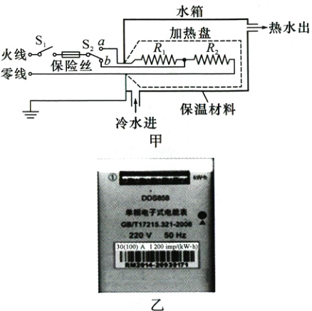 (2024·太原期末)某校宿舍安装了某品牌速热式电热水器,该电热水器的铭牌标明:加热功率为4 400 W,保温功率为100 W;内部结构如图甲所示,R1、R2是水箱中加热盘内的电热丝。水箱放满水后闭合开关S1开始加热,当水温升高到40 ℃时,温控开关S2自动切换到保温状态。观察发现,某天当一寝室只有热水器工作时,将一箱20 kg的冷水加热1 min,热水器显示屏显示水温由20 ℃上升到22 ℃,同时本寝室的电能表(如图乙)指示灯闪烁了80次。已知:c水 = 4.2×10³ J/(kg·℃),不考虑电阻随温度变化。求: