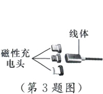 3. (2024·山西模拟改编) 如图所示是一款磁吸式数据线,含有磁体的线体可以和不同型号的具有磁性的充电头吸附对接,达到“一线多头”的使用效果。线体和充电头吸附是因为__________________。