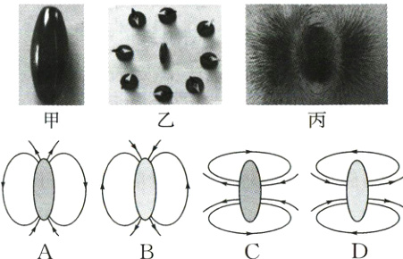 15. 小冬学习磁学知识后,想研究橄榄形磁体(如图甲)周围的磁场分布情况,做了如图所示的实验,其中图乙是小磁针(黑色为N极)静止时的指向,图丙是铁屑静止时的分布情况。下列选项中能正确用磁感线描述以上实验现象的是 ( )