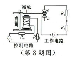 8.(2024·朔州模拟)创新小组利用电磁继电器(电磁铁线圈电阻不计)制作了具有加热、保温等功能的恒温(40℃)加热器,如图所示。温度为40℃时,通过控制电路的电流为0.03 A,热敏电阻R的阻值随温度的变化而变化,电压U₁=3 V,定值电阻R₀=60 Ω;工作电路的电压U₂=220 V,R₁与R₂为加热电阻丝,当温度低于40℃时开启加热挡位。下列说法中正确的是 ( )