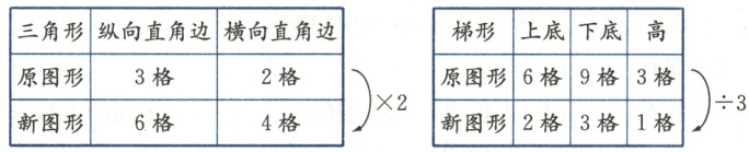 例1 在方格纸上把三角形按照2:1的比放大,把梯形按照1:3的比缩小。