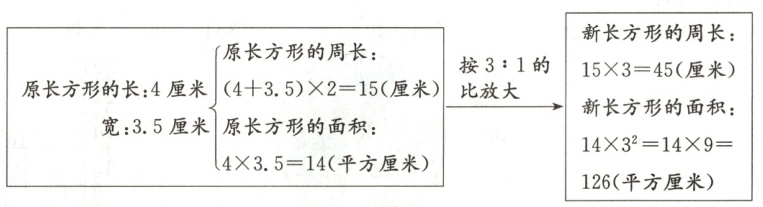 例2 把一个长是4厘米、宽是3.5厘米的长方形按3:1的比放大后,得到的新图形的周长是( )厘米,面积是( )平方厘米。