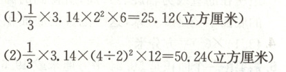 $\frac{1}{3}×3.14×4^{2}×3 = 50.24$(立方厘米)