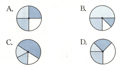【解析】把$6 + 24 + 6 + 12 = 48$(张)票看作单位“1”,用整个圆表示。王皓得了24张票,占48张票的一半,用$\frac{1}{2}$圆表示;肖刚得了12张票,占48张票的$\frac{1}{4}$,用$\frac{1}{4}$圆表示;李轩和丁丁各得了6张票,分别用$\frac{1}{8}$圆表示,因此选择B。