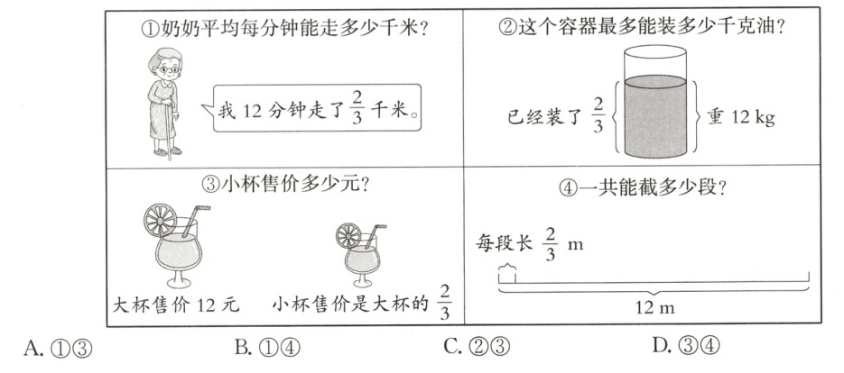 5. A [解析]①奶奶用12分钟走了$\frac{2}{3}$千米,求奶奶平均每分钟能走多少千米,用除法计算,列式为$\frac{2}{3}÷12$。②已装了$\frac{2}{3}$,重12 kg,求这个容器最多能装多少千克油,用除法计算,列式为12÷$\frac{2}{3}$。③大杯售价12元,小杯的售价是大杯的$\frac{2}{3}$,求小杯售价多少元,用乘法计算,列式为12×$\frac{2}{3}$。④每$\frac{2}{3}$m截一段,求一共能截多少段,用除法计算,列式为12÷$\frac{2}{3}$。