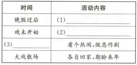 7. (考点:梳理情节)文章第②~⑥段以时间为顺序,回忆儿时和小伙伴看戏的往事。阅读选文,完成下列表格。(3分)