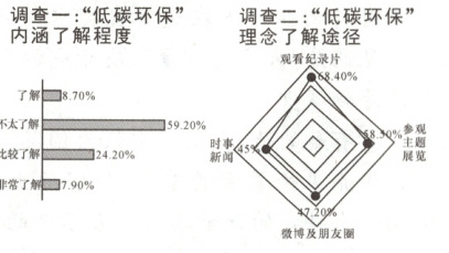 (2)示例:①受访同学中,大多数人不太了解“低碳环保”的内涵,只有极少数人非常了解“低碳环保”的内涵。②大多数同学是通过观看有关纪录片及参观主题展览的方式来了解“低碳环保”理念的。