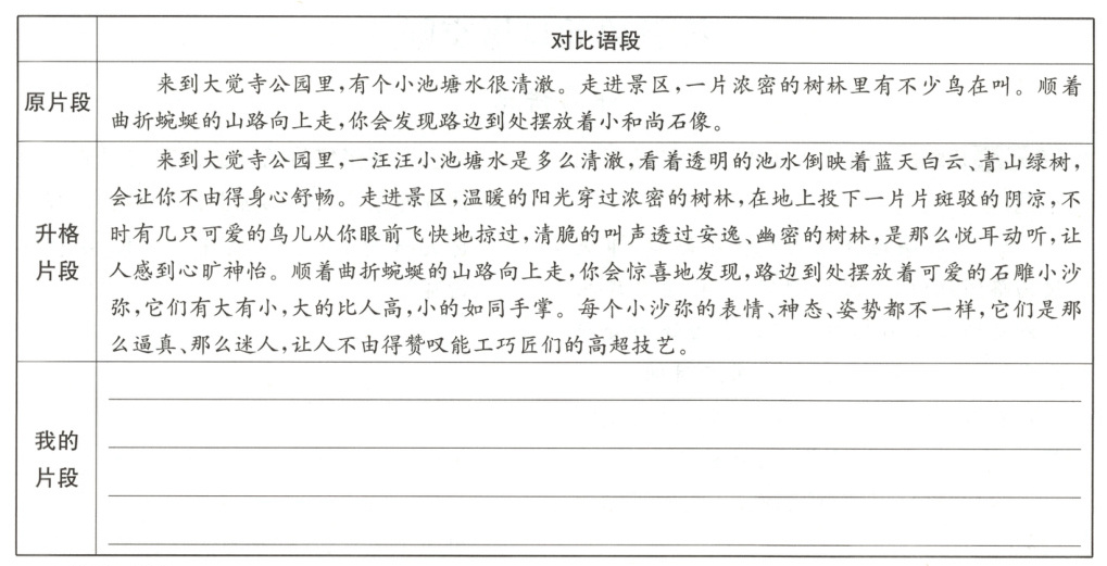 认真对比下面两个文段,仔细体会游记的写作特点,写一个游记片段。(150字左右)