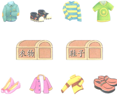 2. 把下面的物品分类放在两个储物箱里,用线连一连。