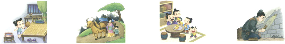 图片从左到右依次为:黄香扇枕、孟母三迁、孔融让梨、凿壁偷光。