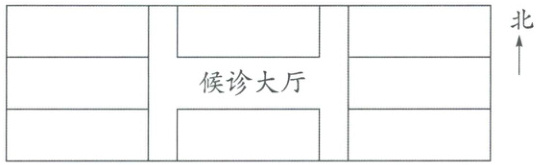 (1)候诊大厅的西北面是儿科门诊,东南面是口腔门诊,东北面是外科门诊,西南面是中医门诊。