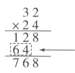 (1) 如果兰兰每天读32页,24天刚好可以读完一本书,那么这本书共有多少页?一位同学列竖式解决了这个问题(如右下图),箭头所指的这一步表示( )。