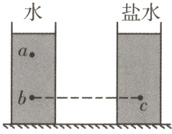 B[解析]根据液体压强公式$p = \rho gh$可知,液体内部压强取决于液体的密度和深度,对于a、b两点,因为密度相同,$h_{b} > h_{a}$,所以$p_{b} > p_{a}$;对于b、c两点,因为$\rho_{盐水} > \rho_{水}$,$h_{c} = h_{b}$,所以$p_{c} > p_{b}$,因此a、b、c三点的压强大小关系为$p_{c} > p_{b} > p_{a}$,故选B.