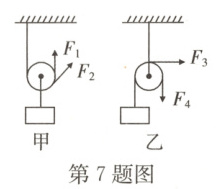 7. 如图所示,用同一滑轮匀速提升同一重物(不计绳重和摩擦). 图中F₁、F₂、F₃、F₄之间的关系正确的是 ( )