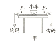 (1)如图甲所示,把小车放在水平桌面上,当在左侧和右侧同时悬挂一个质量相等的钩码时,小车处于静止状态;改变其中一侧钩码的质量,发现小车无法保持静止状态,由此说明两个力必须________才能平衡.