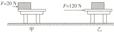 15. 小金用 20 N 的水平推力把图甲中纸箱匀速推往桌面中央,桌子始终保持静止;小金再用 120 N 的水平推力将桌子沿水平方向匀速推动,纸箱在桌面上没有发生滑动,如图乙所示.回答下列问题.