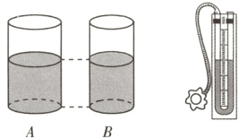 18. (2024·扬州中考)如图所示,底面积不同的圆柱形容器A、B放在水平桌面上,两容器中水的深度相等,水对容器底部的压强分别为pA和pB,则pA________pB;已知B容器底面积为50 cm²,总重为8 N,B容器对桌面的压强为________ Pa;将压强计橡皮膜朝下分别放入两容器的底部,压强计U形管两边液面的高度差分别为ΔhA和ΔhB,多次实验发现ΔhA均小于ΔhB,该现象产生的原因是______________________________。